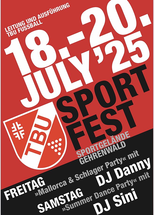 Am 18.-20.07.25 fand das diesjährige TBU-Sportfest auf unserem schönen Sportgelände im Gehrenwald statt. Von Freitagnachmittag bis Sonntagabend war bei sommerlichen Temperaturen einiges los auf dem Gelände und natürlich war für das leibliche Wohl auch bestens gesorgt.